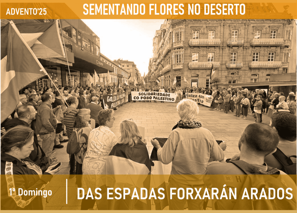 Cantas veces temos cantado estas palabras na nosa parroquia! Isaías anunciaba a utopía dun mundo posible como poucos profetas o fixeron ao longo da Historia, coa convicción entolecida dunha fe que o traspasaba, que nos traspasa aínda hoxe. Non son so palabras fermosas, é un proxecto de vida, persoal e comunitario, é un proxecto relixioso e político, que reclama a nosa implicación, porque nos negamos a convivir co amargor dunha vida sen esperanzas. Abonda xa de atoparnos coa violencia acotío, como se fose o noso pan de cada día. Hoxe máis que nunca queremos sementar sendeiros de paz, da man, sempre xuntas. Velaí o noso compromiso.