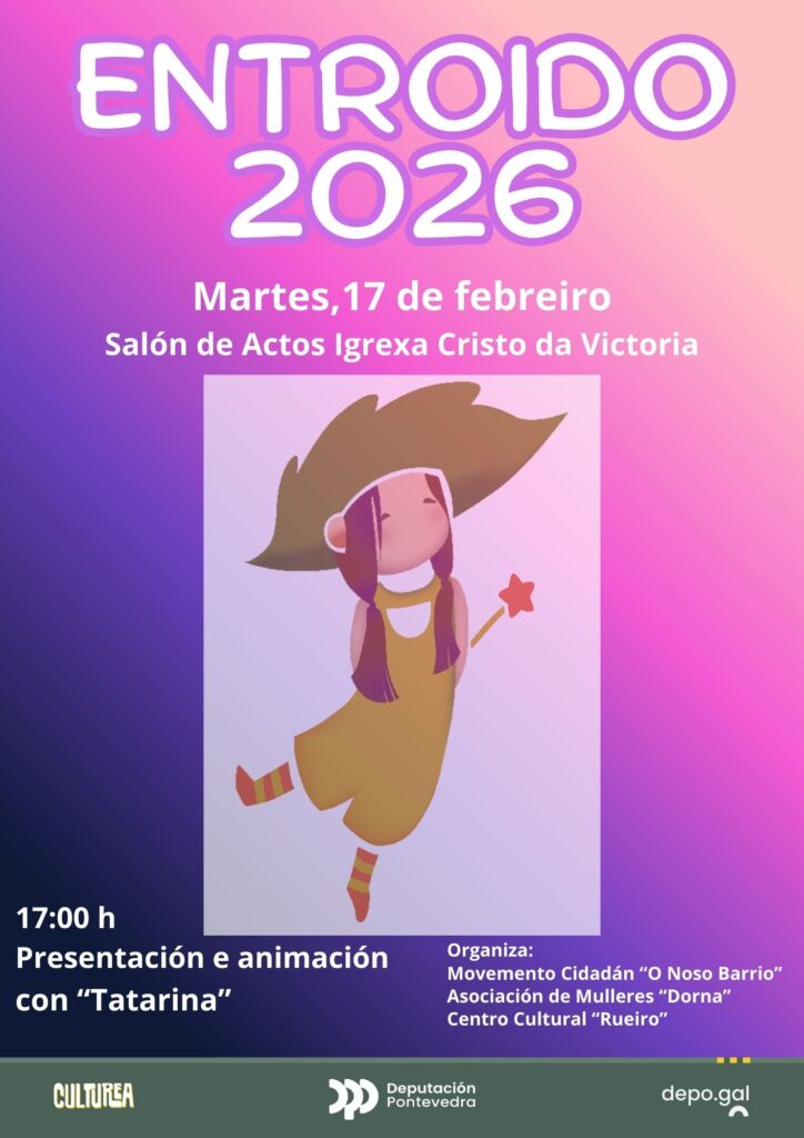 Como cada ano, hai que manter as tradicións, en particular as festeiras, nestes tempos nos que parece que nos arrodean as malas novas. Por iso, voltamos a celebrar a Festa do Entroido grazas a colaboración do Movemento Cidadán «O Noso Barrio», a Asociación de Mulleres «Dorna» e o Centro Cultural «Rueiro», que nos convidan a achegarnos ao salón de actos da parroquia a tarde do vindeiro Martes, 17 de febreiro, para pasar un bo rato coa animación e presentación das amigas de «Tatarina».